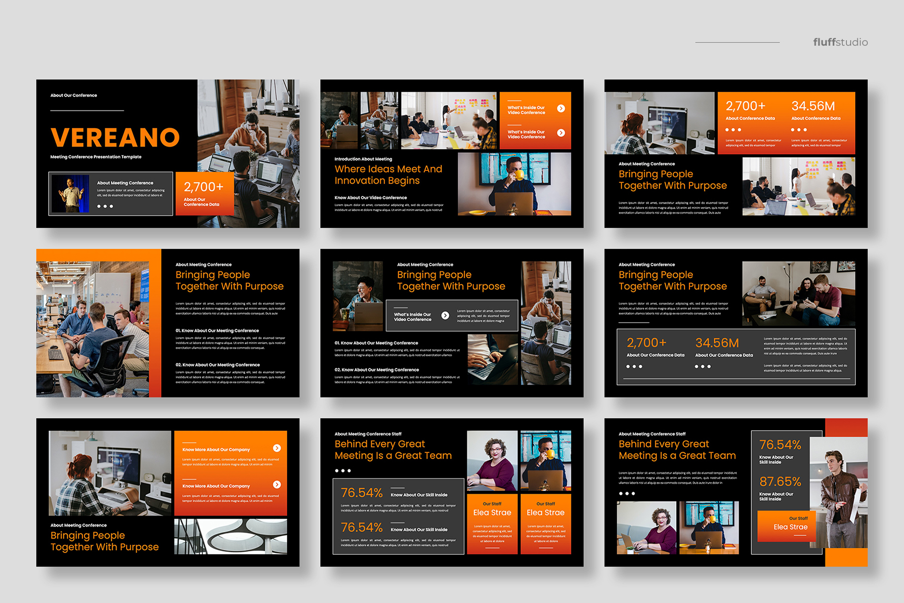 Vereano, созданный для универсальности, идеально подходит для бизнес-конференций, ежегодных собраний, академических симпозиумов, презентаций продуктов, демонстраций стартапов, отраслевых форумов, саммитов лидеров и корпоративных тренингов. Его современная система дизайна позволяет доносить данные, идеи и стратегии понятным и увлекательным визуальным языком.