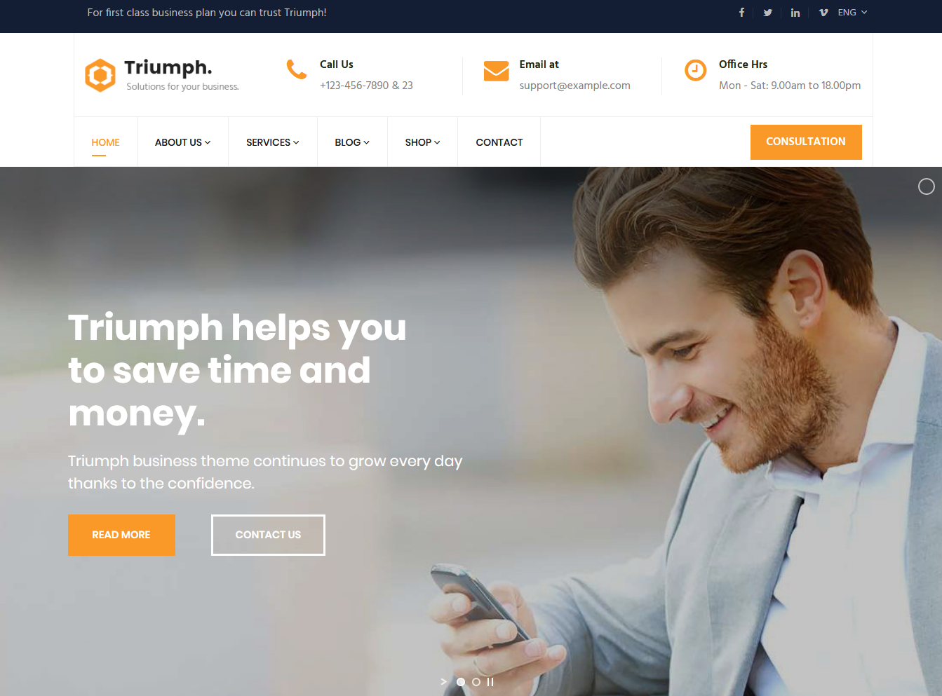 Triumph Business Consulting и профессиональные услуги Joomla Шаблон, созданный специально для всех видов консалтингового бизнеса, начинающей компании, финансового бизнеса и т. Д. Triumph лучше всего подходит для корпоративного веб-сайта, такого как консалтинговые фирмы, страхование, кредит, налоговая помощь, инвестиционная фирма и т. Д. Это бизнес-шаблон, полный справки для присутствия в Интернете для корпоративных и финансовых компаний. Триумф полностью отзывчивый! Сильный акцент на смартфонах и планшетах. Этот шаблон поставляется с необходимыми функциями для вашего присутствия в Интернете, такими как портфолио, блог, отзыв о магазине и т. Д. Triumph может быть отличным выбором для вашего присутствия в Интернете. Triumph основан на платформе Helix Ultimate, созданной с помощью Sp Page builder Pro, Layer Slider и J2store в качестве электронной коммерции.Сила плагинов в комплекте: